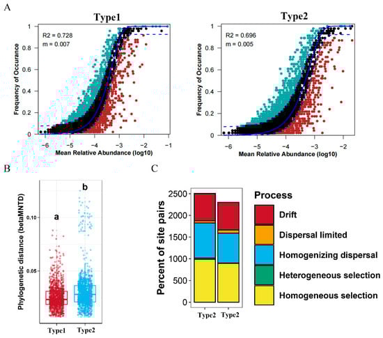 Neutral processes, on the other hand, refer to ecological dynamics that are governed primarily by random or stochastic factors rather than deterministic forces [,]. Unlike niche-based processes, which emphasize the importance of species traits and environmental conditions in shaping community structure, neutral processes operate under the assumption of ecological equivalence among species. The neutral process theory assumes that microbial loss and gain show a random balance in taxa, that is, random processes (birth, death, migration, immigration, speciation, and limited dispersal) shape the structure of the microbial community [,].
