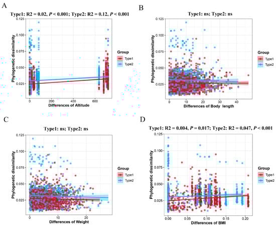 The βNTI metric was utilized to assess whether species interactions within a community aligned with their expected relationships based on their shared evolutionary history. In essence, it quantified the extent of the deviation between the relatedness of species in their shared evolutionary history and their actual relationships within the community. Initially, βMNTD was computed by calculating the branch lengths of bacterial phylogenetic trees, followed by the standardizing of the residuals between the observed values and expected values (obtained through 999 randomizations), which were then normalized to estimate βNTI. Subsequently, Mantel tests were employed to examine the correlation between βNTI and the pertinent factors. Our findings revealed a significant positive correlation between βNTI values and both altitude and body mass index (BMI) across the two intestinal types. This indicated that alterations in environmental factors induced substantial inconsistencies between the species interactions in the microbial communities and their expected relationships based on evolutionary history. Alternatively, it suggested a decay in similarity among gut microbial communities across individuals as a result of geographical distance. This finding aligned with conclusions drawn from studies on species such as house mice [,,,,], pikas [], woodrats [], and wild leaf miners []. Variations in altitude and BMI may play a role in the systematic phylogenetic turnover differences or compositional disparities observed in the formation of the two enterotypes of gut microbiota. This could be attributed to the direct or indirect impact of altitude and BMI variations on host physiological conditions, metabolic activities, and immune system functionality [,,,]. These factors may affect the stability of the host’s gut environment and the availability of ecological niche space, resulting in alterations in the structure and function of microbial communities [,]. Additionally, changes in altitude and BMI may also influence the interaction between the host and the external environment, including diet, lifestyle, and microbial sources [,], thereby affecting the composition and diversity of microbial communities. Thus, variations in altitude and BMI may influence the assembly processes of microbial communities through multiple pathways, leading to differences in microbial community composition between the different enterotypes.