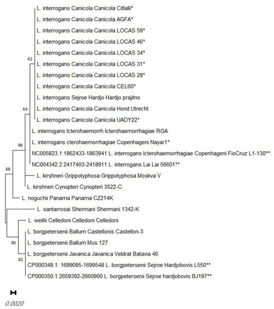 DNA was obtained from all ten isolates, and a 16S rRNA gene amplicon was generated via PCR and sequenced. Overall, 16S rRNA phylogenetic studies showed that all isolates belong to the species L. interrogans (Figure 1).