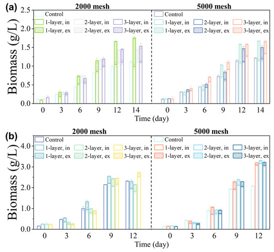 Choice of screen aperture and number of layers. The biomass concentrations of (a) Coelastrella sp. and (b) D. salina were cultured in different numbers of screen layers, with 2000 mesh or 5000 mesh screens. The microalgal strains were cultured using standard medium (Coelastrella sp. using BG11, and D. salina using SP). “Control” indicates the condition without any screen. The “1-layer”, “2-layer”, and “3-layer” labels indicate the use of 1, 2, and 3 layers of screens, respectively. The label “in” indicates the part inside the screens, and “ex” indicates the part that underflows the screens.