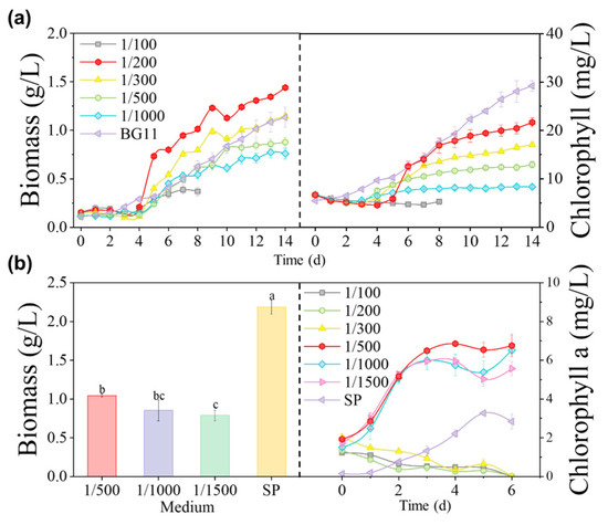 The final harvested biomass concentrations of S. subsalsa are shown in Figure 3b. The optimal biomass concentration was 1.04 g/L in 1/500 MSGR. However, this was still much lower than the 2.19 g/L achieved in the SP medium. In this study, we used raw MSGR to reduce the cultivation cost. However, organic matter in the media stimulated bacterial and zooplankton proliferation, which competed with microalgae for nutrients and caused algal cell decomposition and death. The growth of S. subsalsa in SE with MSGR was significantly lower than in SP, which is an inorganic medium rich in macro- and micronutrients, with a total N/P mass ratio of five. This ratio matches the elemental composition of microalgal cells and is optimal for their growth. On the other hand, MSGR contains complex organics, complexes, and precipitates that are not readily available for microalgae, and often have the N/P ratio deviating from five.