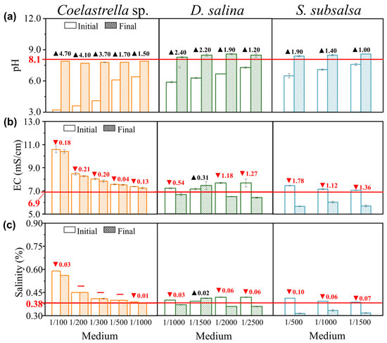The changes in (a) pH, (b) electrical conductivity (EC), and (c) salinity before and after adding different volume ratios of MSGR to soil extracts (VMSGR/VSE) when culturing Coelastrella sp., D. salina, and S. subsalsa. The label “initial” means before cultivation, and “final” means after cultivation. The red arrows and numerical values represent decreases, while black arrows and numerical values represent increases. The values corresponding to the red horizontal lines represent the pH, EC, and salinity of the pure soil extract.