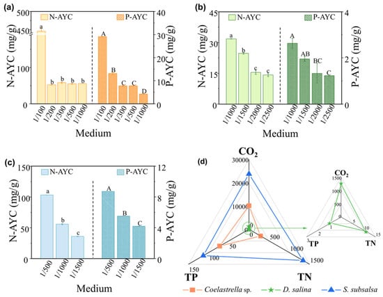 The average yield coefficients of total nitrogen (N-AYC) and total phosphorus (P-AYC) for (a) Coelastrella sp., (b) D. salina, and (c) S. subsalsa in SE supplemented with MSGR in different volume ratios (VMSGR/VSE). (d) Predicted rates of carbon dioxide, total nitrogen, and total phosphorus (kg/ha/year) assimilation by Coelastrella sp., D. salina, and S. subsalsa after underflowing and entering the soil pond of eco-farms, using the selected optimal screen and MSGR addition ratios. Data followed by different letters (a, b, c or A, B, C, and D) have a statistically significant difference by Duncan’s test at p < 0.05.