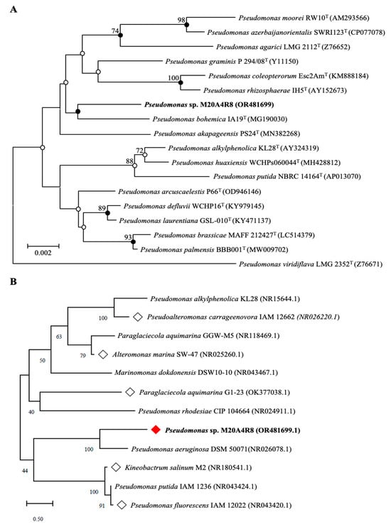 Comparative analysis of the 16S rRNA gene showed that the M20A4R8 strain was closely related to Pseudomonas bohemica IA19T with a similarity of 98.56%. Phylogenetic analysis of the 16S rRNA gene using the NJ, ML, and MP algorithms showed that the M20A4R8 strain formed a monophyletic clade with other members of the genus Pseudomonas (Figure 1A). Consequently, sequence comparisons based on almost complete 16S rRNA gene sequences showed a clear affiliation of the isolate to the genus Pseudomonas.
