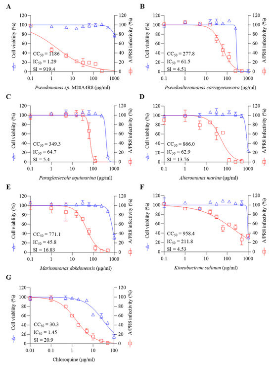 Marine bacteria whose extracts were subjected to preliminary antiviral screening against A/PR8 by pre- and post-treatment in MDCK cells. (A) Pseudomonas sp. M20A4R8, (B) Pseudoalteromonas carrageenoora, (C) Paraglaciecola aquimarina, (D) Altermonas marina, (E) Marinomonas dokddonensis, (F) Kineobactrum salinum, and (G) Chloroquine. All data in the graphs are presented as arithmetic means ± S.D. from 3 independent experiments.