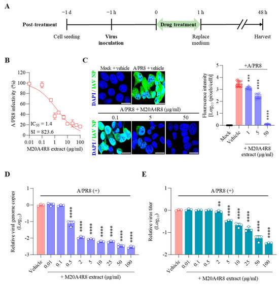 Antiviral effect of M20A4R8 extract post-treatment after infection with influenza virus A/PR8 (0.1 MOI) in MDCK cells. (A) Schematic diagram of virus inoculation and extract treatment. (B) IC50 and SI of M20A4R8 extract measured by CPE-inhibition assay. (C) Representative IFA images (on the left) of virus replication under vehicle or extract treatment using an anti-IAV NP antibody (AF488). Cell nuclei were stained with DAPI. The quantification (on the right) of viral protein was produced by mathematical calculation of positive signals per cell. Bar = 20 µm. (D) Viral genome copies detected by RT-qPCR. (E) TCID50 measured progeny virus production. All data in the graphs are presented as arithmetic means ± S.D. from 3 independent experiments. **, p < 0.01; ***, p < 0.001; ****, p < 0.0001.