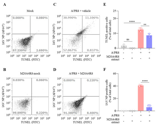 Flow cytometry-measured antiviral evaluation targeting apoptotic reaction of MDCK cells infected with mock or influenza virus A/PR8 (1 MOI) and treated with vehicle or M20A4R8 extract. The apoptosis and viral protein levels were measured by TUNEL assay and immunoreaction targeting IAV NP, respectively. Mock-infected, vehicle-treated group (A); mock-infected, M20A4R8 extract-treated group (B); A/PR8-infected, vehicle-treated group (C); and A/PR8-infected, M20A4R8 extract-treated group (D). Graphs summarizing flow cytometry data (E,F). The fluorescence quantification of TUNEL- (E) or IAV NP-positive cells (F), which were treated with the vehicle or M20A4R8 extract. All data in the graphs are presented as arithmetic means ± S.D. from 3 independent experiments. **, p < 0.01; ****, p < 0.0001. ns, not significant, IAV NP, nucleoprotein.