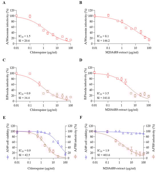 To measure in vitro broad-spectrum antiviral effect, antiviral evaluation against multiple strains of influenza virus was performed. As expected, the post-treatment of M20A4R8 extract dramatically exerted antiviral efficacies against influenza virus A/H3N2 (IC50 = 8.1 µg/mL, SI = 146.2) and B/Florida (IC50 = 3.5 µg/mL, SI = 343.8) at an MOI of 0.1, which were much greater than chloroquine (Figure 5A–D).