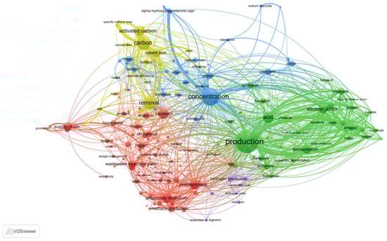 Overlay visualisation of utilisation of municipal sludge anaerobic fermentation resources (the size and colour of the nodes indicate correlations and different fields of immobilization, respectively).