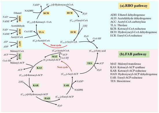 Each cycle adds two carbon atoms, but the FAB pathway is more active and consumes more ATP. Both the FAB and RBO pathways depend on acetyl-CoA to initiate the cycling process [54]. The FAB cycle begins with the production of acetyl-CoA by ED, acetyl-CoA in the presence of acetyl-CoA carboxylase (ACC), and the consumption of ATP to produce malonyl-Coenzyme A (malonyl-CoA). Then, in the presence of ketoacyl synthetase (KAS), there is an initial condensation reaction between acetyl-CoA and malonyl-ACP to produce acetyl-ACP. Acetyl-ACP is then reduced to butyryl-ACP [55] and butyrate [56] through the action of acyl-ACP thioesterase (TES). In this particular cycle, butyryl-ACP is converted to hexanoyl-ACP, which has two extra carbon atoms in its chain and is then hydrolysed by TES to become caproate [57]. To enter this cycle, butyryl-ACP is first condensed with additional malonyl-ACP molecules by ketoacyl synthase (KAS). In terms of energy synthesis, one molecule of ATP is consumed for each molecule of malonyl synthesised, and the FAB pathway requires more ATP than the RBO pathway, resulting in lower MCFA production efficiency [58].