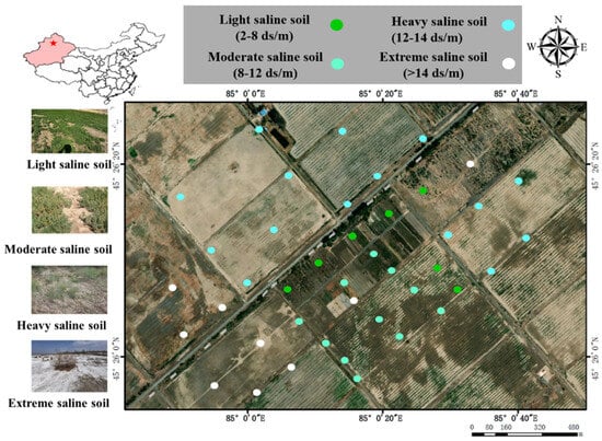 The study area is located at a typical saline botanical garden (45°26′10″ N, 85°0′20″ E) in Xinjiang province, China, established by the Xinjiang Institute of Ecology and Geography, Chinese Academy of Sciences. Situated in the piedmont alluvial slope plains of the Altay Mountains in the northern part of Karamay City, the study area comprises gravel, sand, and sandy soil of varying thicknesses (Figure 1). Local features include erosional gullies, with terrain sloping from northwest to southeast at an inclination of 2°, with elevations ranging from 379 to 485 m above sea level. The predominant surface landscape consists of a gravel desert characterized by arid and super-arid shrubs, along with salt meadows [32].