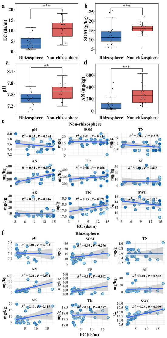Differences in the physicochemical properties between non-rhizosphere and rhizosphere soils: (a) EC; (b) SOM; (c) pH; and (d) AN. ** p < 0.01 and *** p < 0.001. The relationship between salinity and other physicochemical properties in (e) non-rhizosphere soil and (f) rhizosphere soil based on linear regression analysis. EC: electrical conductivity, SOM: soil organic matter, TN: total nitrogen, AN: available nitrogen, TP: total phosphorus, AP: available phosphorus, TK: total potassium, AK: available potassium, and SWC: soil water content. The gray represents the confidence interval, the blue line represents the linear regression line, and the balls of different colors represent different samples.