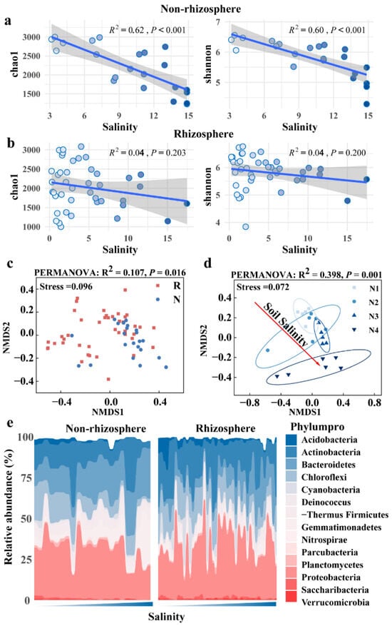 Differences in bacterial communities between non-rhizosphere and rhizosphere soils: the relationship between alpha diversity and salinity revealed by linear regression in (a) non-rhizosphere soil and (b) rhizosphere soil, the gray represents the confidence interval, the blue line represents the linear regression line, and the balls of different colors represent different samples; and (c) bacterial community structure visualized by NMDS based on Bray–Curtis dissimilarities between non-rhizosphere and rhizosphere soils. N means non-rhizosphere soil, R means rhizosphere soil; and (d) is the response of bacterial community structure to salinity level in non-rhizosphere soil. N1–N4 represents non-rhizosphere soils with different salinities the ellipse represents the confidence interval ellipse for each group. The specific divisions are shown in Table S1; (e) changes in taxa (at the phylum level) relative abundance with salinity.