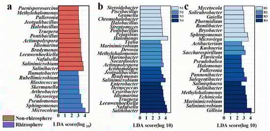 Major differentially abundant taxa (LDA threshold 3.0, p < 0.05) between non-rhizosphere and rhizosphere soils (a) and major differentially abundant taxa (LDA threshold 3.0, p < 0.05) between different salinity levels in (b) non-rhizosphere and (c) rhizosphere soils. The different salinity levels in non-rhizosphere soil are classified as N1–N4, while the different salinity levels in rhizosphere soil are classified as R1–R4. The specific criteria for this classification are shown in Table S1.