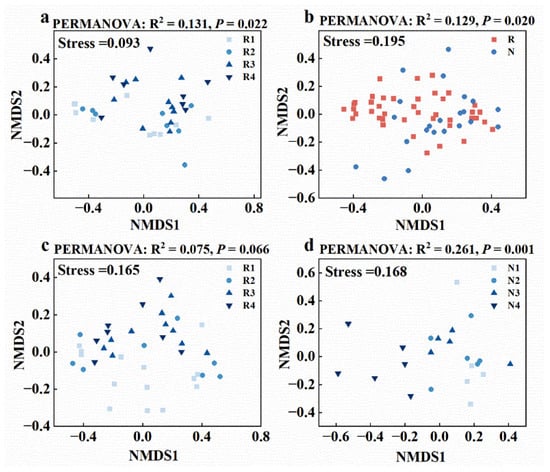 Rhizosphere bacterial community structure under different salinity levels: (a) differences in (b) fungal community structure between non-rhizosphere and rhizosphere soils; the response of fungal community structure under different salinity levels in (c) rhizosphere and (d) non-rhizosphere soils. N means non-rhizosphere soil, R means rhizosphere soil, and the different salinity levels in non-rhizosphere soil are classified as N1–N4, while the different salinity levels in rhizosphere soil are classified as R1–R4. The specific criteria for this classification are shown in Table S1.