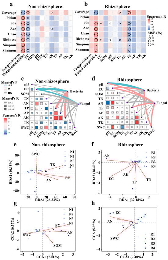 Effects of biotic and abiotic factors on bacterial and fungal communities in saline soils. The contributions of various factors to bacterial alpha diversity in (a) non-rhizosphere and (b) rhizosphere soils predicted by correlation and random forest models. The size of the circles indicates the importance of the variables based on the percentage of increase in mean square error (increase in MSE (%); only those with p < 0.05 are retained). The color gradient indicates the Spearman correlation coefficient. The effects of soil environmental factors on bacterial community composition in (c) non-rhizosphere and (d) rhizosphere soils, assessed by the Mantel test. The color and thickness of the lines indicate the significance and correlation coefficient of the Mantel test, respectively; the color gradient and block size indicate the Pearson correlation coefficient. Major soil factors affecting bacterial and fungal beta diversity in (e,g) non-rhizosphere and (f,h) rhizosphere soils identified by RDA and CCA, respectively (only significant factors with p < 0.05 are retained). The different salinity levels in non-rhizosphere soil are classified as N1–N4, while the different salinity levels in rhizosphere soil are classified as R1–R4. The specific criteria for this classification are shown in Table S1.