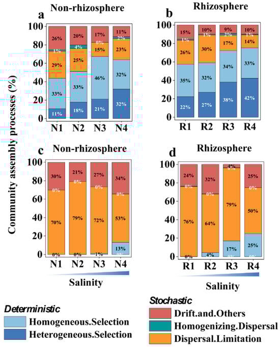 Effects of biotic and abiotic factors on microbial community assembly in saline soils. The proportion of community assembly processes for soil bacteria in (a) non-rhizosphere and (b) rhizosphere soils and fungi in (c) non-rhizosphere and (d) rhizosphere soils under different salinity levels. The different salinity levels in non-rhizosphere soil are classified as N1–N4, while the different salinity levels in rhizosphere soil are classified as R1–R4. The specific criteria for this classification are shown in Table S1.