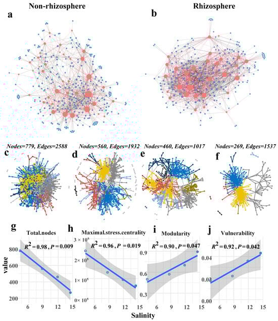 Bipartite and co-occurrence networks of soil microbial communities under salt stress. The bipartite networks in (a) non-rhizosphere and (b) rhizosphere soils, where the nodes are colored blue (red) for bacteria (fungi), the node size indicates the degree, and the red (black) links indicate positive (negative) correlations. The evolution of the bacterial co-occurrence network structure under different salinity levels in non-rhizosphere soil ((c): N1, (d): N2, (e): N3, (f): N4), where the nodes and links are colored according to module attributes. (g–j) The changes in bacterial co-occurrence network topology with salinity in non-rhizosphere soil (g): total nodes, (h): maximal stress centrality, (i): modularity, (j): vulnerability), the gray represents the confidence interval, the blue line represents the linear regression line, and the balls of different colors represent different samples. The different salinity levels in non-rhizosphere soil are classified as N1–N4. The specific criteria for this classification are shown in Table S1.