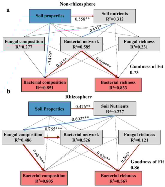 PLS-PM revealed the impacts of different factors on bacterial communities in non-rhizosphere (a) and rhizosphere (b) soils. PLS-PM described the relationships among soil properties (EC, pH, SWC, and SOM), soil nutrients (TN, TP, TK, AK, AP, and AN), fungal composition (fungal composition differences among samples (NMDS1 axis)), bacterial network (topological properties of each subnetwork, i.e., node number, network average degree, average path length, centrality betweenness, modularity, and vulnerability), fungal richness (fungal Sobs index) in relation to bacterial composition (bacterial composition differences among samples (NMDS1 axis)), and bacterial richness (bacterial Sobs index) in saline soils. The red and blue arrows reflect positive and negative relationships, respectively, with widths proportional to the strengths. The solid black arrows indicate non-significant relationships. The numbers beside the arrows are the standardized path coefficients. * p < 0.05, ** p < 0.01, and *** p < 0.001.