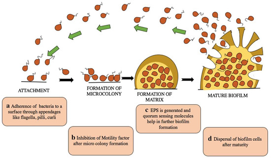Stages of biofilm formation: adherence of bacteria to the surface (a); inhibition of motility factor (b); generation of EPS and quorum sensing leading to mature biofilm formation (c); dispersal of mature cells (d) [28].