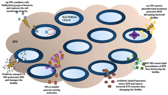 There is a severe threat posed by the ability of biofilms to grow and resist antibiotics. Various nanotechnology-based strategies have been studied and developed to prevent and combat serious health problems caused by biofilm infections. Factors such as mechanical stress, enzymatic digestion, oxygen availability, temperature, pH, and limited nutrition bring about the dispersal of bacteria from the biofilm, with bacteria becoming susceptible to antibiotics [56,57]. Nanoparticles (NPs) can play a vital antibiofilm role by EPS matrix disruption, dispersal of bacteria, and increasing susceptibility to antibiotics [57,58]. The NPs adopt various mechanisms to destroy biofilm. TiO2 NPs produce ROS in the bacterial cells, lipid peroxidation of EPS, cell membrane disruption, and the formation of extracellular polysaccharides (Figure 2) [28,48].