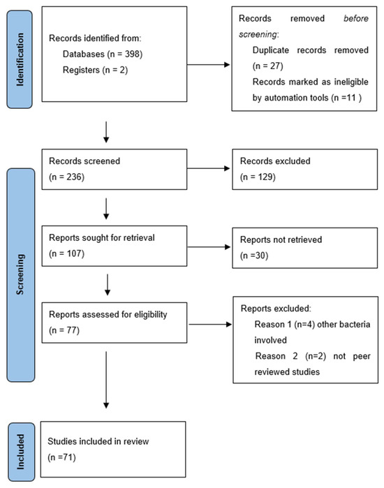 The database search identified 398 records, including 27 duplicates. A total of 236 articles were selected for screening; 129 were excluded. Altogether, 77 articles were evaluated regarding eligibility, of which 71 were included in the final analysis; 61 were original reports, and 10 were reviews (Figure 3, Table 1).