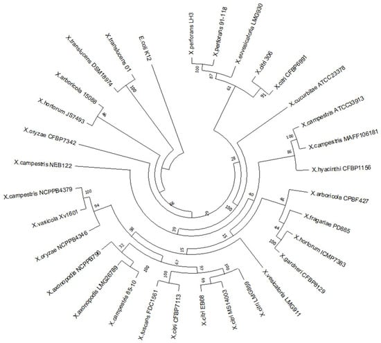 Maximum likelihood phylogeny based on the nucleotide sequences of 31 strains representing the Xanthomonas genus. The phylogenetic tree was inferred using RaxMLversion 8.0.24 and drawn using MEGA X software version 10.1.5. Values on the branches indicate bootstrap values for each branch, expressed as percentages. E. coli K12 was used as the outgroup.