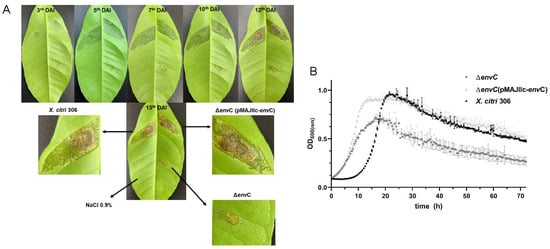 Pathogenicity tests were conducted in triplicate using Rangpur lime (Citrus limonia) as the plant host. Bacterial cultures (X. citri wt, ΔenvC and ΔenvC pMAJIIc-envC) were adjusted to 108 CFU/mL (OD 600 nm of 0.3) using sterile 0.9% NaCl solution and then inoculated on the abaxial surface of leaves using a needleless syringe. The negative control consisted of inoculation with sterile 0.9% NaCl solution. The inoculated plants were kept in a controlled environmental plant laboratory equipped with a HEPA filter to maintain air particle purity. The conditions were set at 28–30 °C, 55% humidity and a 12 h light cycle, and the plants were observed for up to 30 days to monitor the appearance of citrus canker symptoms. The inoculated plants were assessed at 3, 5, 7, 10, 12 and 15 days after inoculation (DAI).