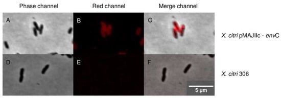 To determine the sub-cellular localization of EnvC encoded by X. citri, we expressed a version of the protein as an mCherry fusion (EnvC-mCherry) (Figure 4). X. citri EnvC-mCherry expressing cells (pMAJIIc-envC) exhibited a strong fluorescence signal, primarily concentrated around the edges of the cells, while the cytoplasm remained non-fluorescent (Figure 4B,C). This phenotype suggests that X. citri EnvC is predominantly localized in the periplasmic region of the cells. Importantly, the wild-type X. citri strain used as a control exhibited no detectable fluorescence emission (Figure 4E,F).