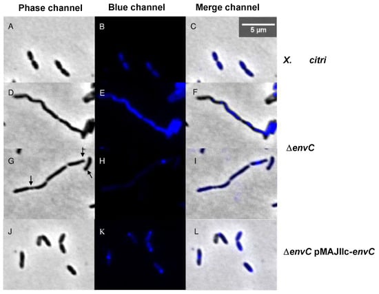 Chromosome organization was visualized using 4′,6-diamidino-2-phenylindole (DAPI) staining (Figure 5). Cultures of the ΔenvC mutant displayed a continuous distribution of chromosomal mass spanning across the elongated cells (Figure 5E,F,H,I). This continuous distribution in some cells possibly hindered septal closure. In contrast, both X. citri and ΔenvC pMAJIIc-envC strains displayed a bilobed chromosome organization pattern with the expected normal distribution, indicating successful complementation of the mutant (Figure 5B,C,K,L). In all strains, a strong nucleoid accumulation signal was also noticeable in the middle or pole of the cells (Figure 5B,H,K), consistent with previous observations in the E. coli wt strain [] and X. citri 306 wt strain [].