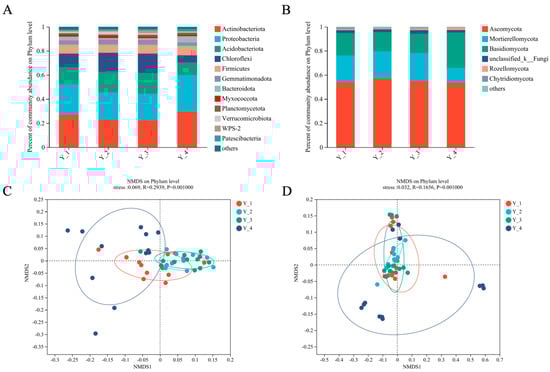 Relative abundance of dominant rhizosphere’s (A) bacterial and (B) fungal compositions grouped by cropping year at phylum classification level. Beta-diversity analysis of (C) bacterial and (D) fungal communities in different cropping years by a non-metric multidimensional scaling plot based on Bray–Curtis distance.
