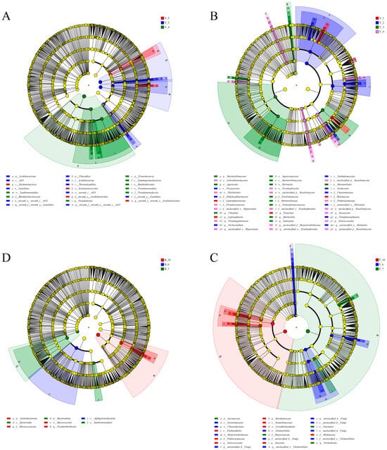 LEfSe diagram of rhizosphere (A) bacterial and (B) fungal communities grouped by cropping year. (C) Bacterial and (D) fungal communities were grouped by collecting month.