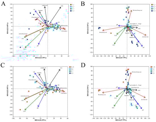 The ordination plots of the results from the redundancy analysis (RDA) to identify the relationships among the rhizosphere (A) bacterial and (B) fungal communities, three bioactive ingredients, the soil physicochemical properties, and the soil enzyme activities grouped by cropping year at the phylum level. The RDA analysis of the (C) bacterial and (D) fungal communities were grouped by collecting month.