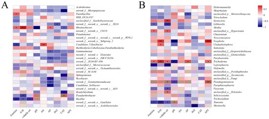 A correlation heatmap of the top 30 genera, three Asarum bioactive ingredients, and soil properties. The rhizosphere (A) bacterial and (B) fungal communities are shown, respectively. The correlation varies according to the right label color. * p < 0.05, ** p < 0.01, *** p < 0.001.