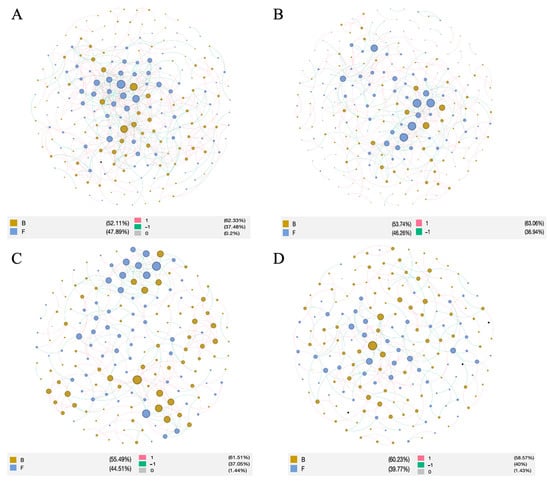 The network topology characteristics of the bacterial and fungal communities in the rhizosphere network. The edge is colored by the correlation relationship, and red and blue represent, respectively, the positive and negative correlations. The node is colored the main phylum. (A) The first cropping year, (B) the second cropping year, (C) the third cropping year, and (D) the fourth copping year.