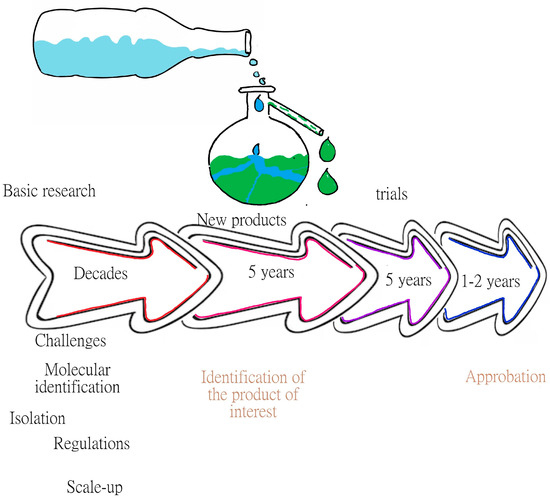 Currently, 600 new species of marine microorganisms are identified and cataloged every year, and it would take up to 1 million years to catalog all the existing species, since it is assumed that there are 2.2 ± 0.18 million marine species [6], which is a restrictive number. It is also assumed that there are prokaryotes in at least ~1.3 million species in the world, of which approximately half have been cataloged, notwithstanding the characterization and identification of the products that may become of biotechnological interest. These data explain, in part, the time invested in the development of products of microbial origin. For example, Pharma Mar S.A. (Madrid, Spain, E.U.) discovered a drug for cancer treatment which then took 15 to 20 years from discovery to commercialization, and while the cost depends on the processes, for that company, it was 802 million USD, resulting in 5 molecules that worked but only 2 molecules were used to recover the investment costs. Figure 1 shows the path of discovery of new products of marine origin. Further, due to their biological activities, the marine environment has proved to be a good source of microorganisms that produce novel compounds with great potential for industrial application [7].