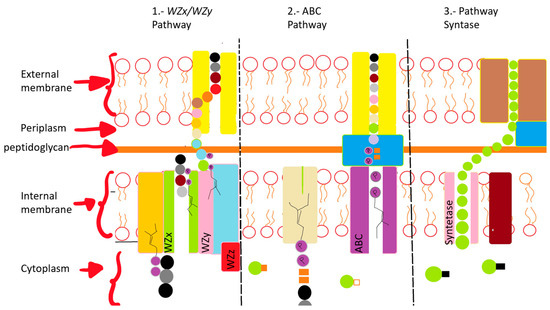 Diagrammatic description of three EPS production pathways. (1) Wzx/Wzy pathway formed by several glycosyltransferases; the translocation to the periplasm is performed with the Wzx flippase; the polymerization is carried out in the polymerase; Wzy Proteins carry out transport across the membranes. (2) ABC transporter-dependent pathway assembles the polysaccharide chain, which is then transported through membranes and the cell wall with the participation of proteins. (3) Synthase pathway carries out polymerization and transport through the synthase complex.