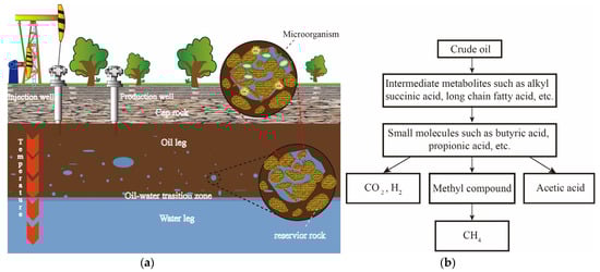 After experiencing natural energy, hydraulic, and chemical displacement, at least 50% of the crude oil in the reservoir cannot be recovered [1], resulting in a decline in the utilization of oil resources. Since the 1980s and 1990s, researchers such as Zengler [2], Anderson [3], and Cheng [4] have confirmed that the synergistic effect of methanogens and methanotrophs can lead to the degradation and conversion of crude oil into methane, thereby reducing resource loss. Consequently, scientists have proposed “bio-gasification” technology for crude oil [5], which aims to degrade the challenging-to-mine hydrocarbons in the reservoir into small molecular substances such as hydrogen and carbon dioxide through microbial action, ultimately converting them into extractable methane [6], as shown in Figure 1.