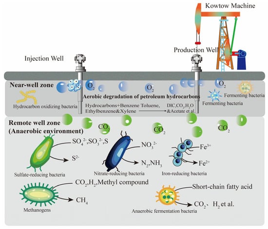 The flora involved in crude oil gasification comprises fermentation bacteria, hydrocarbon-oxidizing bacteria, sulfate-reducing bacteria, nitrate-reducing bacteria, iron-reducing bacteria, and methanogenic archaea [14], as listed in Table 1. As the depth increases, the distribution of crude oil gasification bacteria in the oil reservoir exhibits significant vertical variation, as shown in Figure 2. Aerobic bacteria are primarily distributed in the near-well area, while anaerobic bacteria are mainly found in the far-well end. This distribution pattern arises from the inevitable entry of a small amount of oxygen into the reservoir after a series of oil-displacement methods, creating a relative aerobic zone where aerobic fermentation bacteria and hydrocarbon-oxidizing bacteria are activated to oxidize and degrade hydrocarbons. As hydrocarbon-oxidizing bacteria consume dissolved oxygen in water, an anaerobic environment gradually forms, facilitating the activation of anaerobic and facultative aerobic fermentation bacteria for hydrocarbon degradation. Fermentation bacteria, in conjunction with various reducing bacteria, are responsible for converting hydrocarbons into secondary metabolites such as volatile fatty acids, methyl compounds, acetic acid, carbon dioxide, and hydrogen. Ultimately, methanogenic archaea convert secondary metabolites like methyl compounds, acetic acid, and carbon dioxide into the final product, CH4. Consequently, the crude oil gasification flora can be broadly categorized into two groups: interacting hydrocarbon-degrading flora and methanogenic bacteria, which are responsible for the initial degradation and final methanogenic processes, respectively.