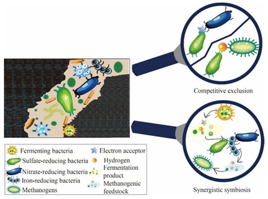 Microbial ecological communities in reservoir crude oil gasification exhibit competitive exclusion, mutualistic symbiosis, partial symbiosis, and parasitism among themselves, as depicted in Figure 3. During crude oil gasification, methanogenic archaea and mutualistic hydrocarbon-degrading bacteria engage in a synergistic symbiotic relationship. Specifically, fermenting and methanogenic bacteria within mutualistic hydrocarbon-degrading communities are often closely associated, facilitating electron exchanges through proton flow, formate, or inorganic conductive particles in nanowires [66] and biofilm matrices [67]. Intercalated hydrocarbon-degrading communities break down complex organic compounds like long-chain alkanes and aromatic hydrocarbons into simple molecules such as carbon dioxide, acetate, and formate, providing the necessary carbon source for the growth and metabolism of methanogens [68,69]. Simultaneously, the energy released from methanogen metabolism supports the growth of intercalated hydrocarbon-degrading bacteria. Additionally, sulfate-reducing bacteria, nitrate-reducing bacteria, and hydrogenotrophic methanogens compete for nutrients because of the shared substrate. Due to the higher energy release in the nitrate reduction reaction compared to the sulfate reduction reaction, nitrate-reducing bacteria exhibit greater substrate competitiveness than sulfate-reducing bacteria when utilizing identical substrates. This enables them to competitively inhibit the production of hydrogen sulfide [70,71,72]. Sulfate-reducing bacteria and hydrogenotrophic methanogens can both utilize hydrogen as an electron donor. In sulfate-rich reservoirs, sulfate-reducing bacteria compete with methanogens for hydrogen as a substrate. Hence, to optimize the gasification efficiency of crude oil, it is imperative to judiciously leverage the interaction dynamics among gasification bacteria. This involves maintaining a balanced ratio of nitrate-reducing bacteria to sulfate-reducing bacteria, as well as sulfate-reducing bacteria to hydrogen-trophic methanogens. Such equilibrium ensures the timely and effective decomposition of intermediate metabolites. Additionally, introducing a suitable quantity of hydrogen-producing and acetogenic bacteria is essential to maximize the efficacy of methanogens.
