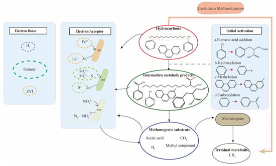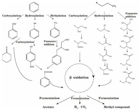 Reservoir crude oil primarily consists of saturated hydrocarbons, aromatic hydrocarbons, asphalt, and other non-hydrocarbons, with over 80% being hydrocarbons [73,74]. Microorganisms degrade the components of crude oil aerobically and anaerobically, gradually transforming them from long-chain complex compounds to small-molecule carbon-containing compounds. Aerobic degradation, involving both facultative anaerobic and aerobic microorganisms, breaks down petroleum hydrocarbons into small molecules like carbon dioxide through the action of oxygenase enzymes, utilizing molecular oxygen as the electron acceptor [75]. In contrast to aerobic degradation, anaerobic degradation is slower and continuous. Facultative aerobic bacteria and anaerobic bacteria use nitrate, sulfate, carbon dioxide, etc. as electron acceptors, ultimately converting petroleum hydrocarbons to CH4 [76,77]. Anaerobic degradation is the predominant process in the gasification of crude oil in reservoirs, typically encompassing multiple reaction steps, including the initiation of activation, fermentation, hydrolysis, anaerobic oxidation, and methanogenesis [78], as depicted in Figure 4. This paper specifically concentrates on the anaerobic degradation of petroleum hydrocarbons and the methanogenic pathway.