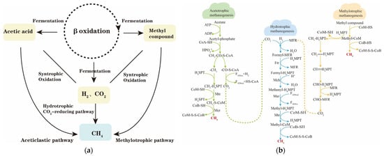 (a) Terminal metabolism process of crude oil gasification; (b) overview of the main methanogenic metabolic pathways.