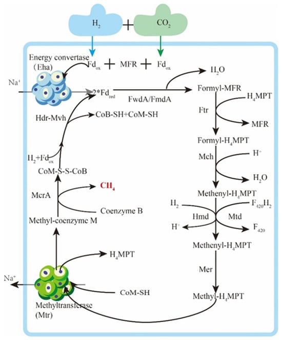 In the hydrogenotrophic methanogenesis reaction, H2 reduces CO2 to methane. This process involves the transfer of carbon units between coenzymes and dehydration condensation reactions, as depicted in Figure 7. Electron transfer is mediated by the deazaflavin coenzyme F420 or ferredoxin (Fd), while various hydrogenases and/or dehydrogenases conduct the reduction of these electron carriers. The realization of the hydrotropic pathway heavily relies on electron transfer, and the current widely recognized electron bifurcation theory based on flavin and the Eha hypothesis of energy conversion hydrogenase play crucial roles. Herrmann et al. [116] proposed the electron bifurcation theory based on flavin, in which flavin protein splits electron pairs into a low-potential electron and a high-potential electron. This process achieves low-potential electron-reducing Fd under the mediation of ferredoxin (Fd) and simultaneously releases energy through the high-potential electron reduction of NADH. Lie et al. [117] verified the electron bifurcation hypothesis based on flavin through experiments and found that the energy-converting hydrogenase Eha, as a means to provide electrons to formylmethanofuran dehydrogenase, can supplement the electron bifurcation in a non-hybrid manner.