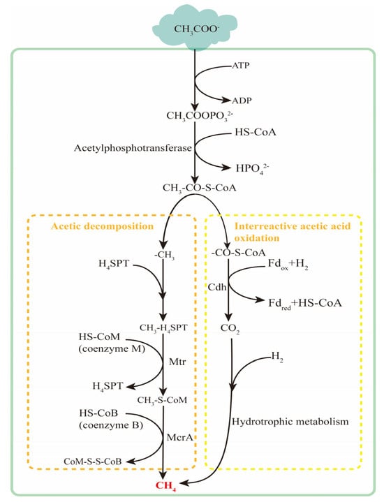 There are two metabolic pathways of methanogenesis using acetic acid as a substrate. One is the direct reduction pathway of acetic acid, involving the direct reduction of methyl in acetic acid to methane, as shown in Figure 8. The second is the interacting acetic acid-oxidation pathway, where acetic acid is oxidized by inter-interacting acetic acid-oxidizing bacteria to produce hydrogen and carbon dioxide, ultimately leading to methane production by hydrogenotrophic methanogens. Both pathways compete for acetic acid as the substrate. Dolfing et al. [118], based on physicochemical theory, analyzed that under high-temperature and low-pH conditions, the reaction of acetic acid mutual oxidation, combined with the h hydrotrophic methanogenesis reaction, is more thermodynamically favorable. High concentrations of carbon dioxide may stimulate the acetic acid-reduction pathway. Studies involving animals or humans, and other research requiring ethical approval, must specify the approving authority and the corresponding ethical-approval code. The two-step reaction involved in the reciprocal oxidation of acetic acid is shown in Equations (1) and (2). The overall reaction for the production of methane from acetic acid is shown in Equation (3).