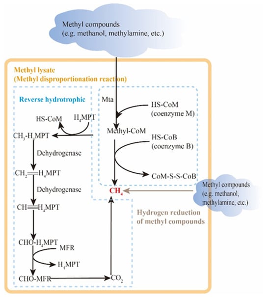 The methylotrophic pathway mainly utilizes methyl compounds such as methanol and trimethylamine as substrates, as depicted in Figure 9. Since methyl species are not as widely distributed in nature as acetic acid and carbon dioxide, the methylotrophic pathway is primarily found in highly mineralized environments such as salt lakes. The methylotrophic pathway can be further categorized into the methyl lyase type and the H2-reduced methyl compound type. The term “methyl cleavage type” refers to the production of methane through the self-disproportionation reaction of methyl compounds. Duszenko et al. [119] discovered that extreme halophilic methanogens, such as methananotronarchaea, utilize C1 methyl compounds as electron acceptors and formate or hydrogen as electron donors. Through the action of methyltransferase, one out of every four methyl compounds is oxidized to CO2 via the reverse hydrotrophic pathway, while the remaining three are reduced to methane, with the loss of electrons being internally resolved. The distinction between H2 reduction of methyl compounds lies in the fact that, during H2 reduction of methyl compounds, methyl compounds solely function as electron acceptors and are directly reduced to methane, making the process more efficient and straightforward. Yang et al. [120] demonstrated that in the anaerobic culture system of carbon dioxide and formic acid in reservoir production fluid, both the symbiotic oxidation of formic acid linked to hydrotrophic methanogenesis and the direct cracking of formic acid methanogenesis occur.