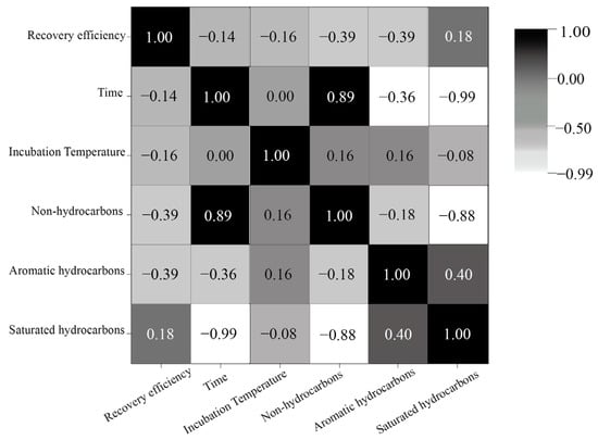 Oil reservoir gasification efficiency is influenced by various factors, including environmental, substrate, and biological variables, as shown in Table 9. A precise evaluation of the relative significance of each factor aids researchers in identifying key regulatory targets, streamlining experimental design, and enhancing time efficiency. To quantitatively assess the relative importance of these factors, Darlingto [142], Johnson [143], and their colleagues introduced evaluation metrics such as the correlation coefficient, partial correlation coefficient, standardized regression coefficient, covariance, dominance analysis, and relative weight. Currently, simple correlation analyses such as the Pearson [144], Spearman [145], and Kendall correlation analyses [146], as well as complex nonlinear analysis methods, including multiple correspondence analysis, classified nonlinear principal component analysis, nonlinear typical analysis, and gray correlation analysis [147], are predominantly utilized for experimental results with relatively small sample sizes. These methodologies have found application in engineering-problem domains, such as the prediction of initial productivity in oil wells. Song Xuanyi and colleagues employed Pearson correlation analysis to construct a correlation matrix for 10 characteristic parameters, including porosity and permeability and subsequently assessed the correlation of each parameter. Their findings revealed a strong linear relationship between porosity and permeability, as well as a correlation between oil-layer thickness, perforation-section thickness, and fracturing light. This suggests the potential for simplified grouping of multiple variables [148]. In this study, utilizing experimental data from Cheng et al. [4] regarding the degradation of various crude oil components at different temperatures and durations, a correlation analysis heat map was generated based on the Spearman correlation coefficient, as depicted in Figure 10. The figure illustrates that saturated hydrocarbons and non-hydrocarbon substances exhibit a significantly higher time dependency compared to aromatic hydrocarbons. Furthermore, a notable correlation between saturated hydrocarbons and non-hydrocarbon substances suggests that saturated hydrocarbons play a pivotal role in enhancing crude oil degradation efficiency.