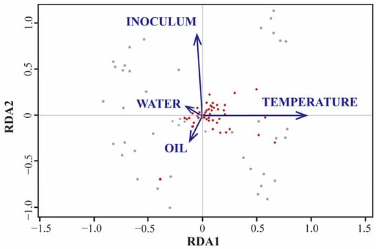 Two-line plot of microbial community redundancy analysis (RDA) under oil, temperature, nutrients, and initial community constraints [149]. The red and gray dots represent the two treatments.