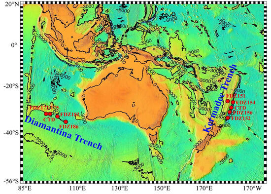 Seawater samples were collected from the Kermadec and Diamantina Trenches during cruise TS29 from November 2022 to March 2023 (Figure 1). Niskin bottles (General Oceanics, Miami, FL, USA) were used to collect WC samples from five different depths (i.e., 0 m, 200 m, 800 m, 2000 m, and 5000 m). BBL samples were collected by the R/V “Fen Dou Zhe” from another eight stations with water depths ranging from 2311 to 9639 m (Table 1). Approximately 2 L of seawater was filtered through 200 μm mesh and was then sequentially filtered through the 3 and 0.22 μm pore size polycarbonate filter (47 mm, EMD Millipore, Billerica, MA, USA). All the filters were then flash frozen and stored at −80 °C until DNA extraction in the laboratory. The in situ environmental parameters (temperature, salinity, and depth) were recorded with a conductivity–temperature–depth (CTD, Sea-Bird Electronics, Bellevue, WA, USA) and the CTD (SBE-49, Seabird Electronics) in the manned submersible the R/V “Fen Dou Zhe”. The concentrations of inorganic nutrients (NO3− + NO2−, NH4+ and PO43−) were analyzed using an auto-analyzer (QuAAtro, Blue Tech Co., Ltd., Tokyo, Japan).