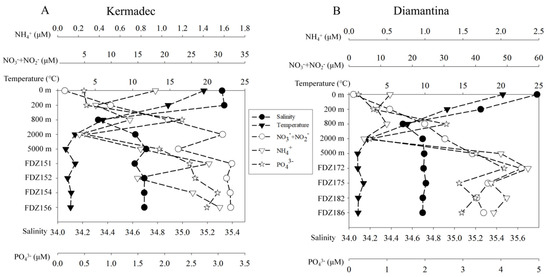 The temperature, salinity, and inorganic nutrients of ambient water samples of the Kermadec Trench (A) and the Diamantina Trench (B). The black circle and triangle symbols stand for salinity and temperature, while the blank circle, triangle, and star symbols stand for NO2− + NO3−, NH4+, and PO43−, respectively.