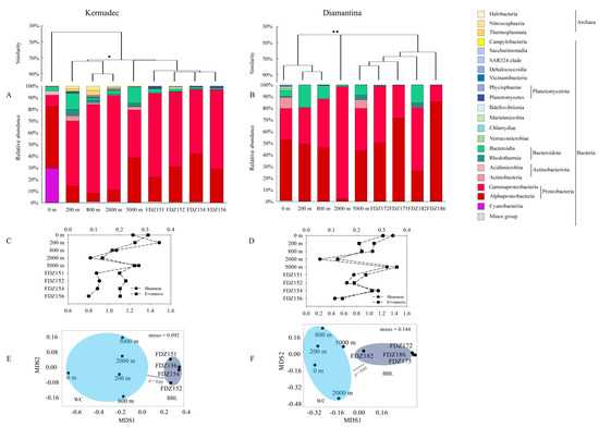 Microbial community structure in the WC and BBL of the Kermadec Trench (A) and the Diamantina Trench (B). * and ** stand for p < 0.05 and p < 0.01. The Shannon index and Evenness index in the WC and BBL of the Kermadec Trench (C) and the Diamantina Trench (D). The black circle and square symbols stand for the Shannon index and Evenness index, respectively. Non-linear multidimensional scaling (nMDS) analysis of microbial communities in the WC and BBL of the Kermadec Trench (E) and the Diamantina Trench (F) based on Bray–Curtis distances.